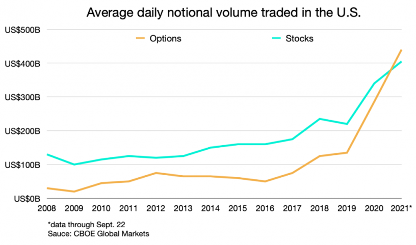 如果你以前读过任何关于期权的文章,现在可能知道TradFi中的期权问题严重。事实上,在美国,通过日常期权交易所代表的股票名义价值已经超过了去年的现货,这是有史以来第一次。其他衍生工具(期货、掉期和其他)加起来早已远超过股票市值。