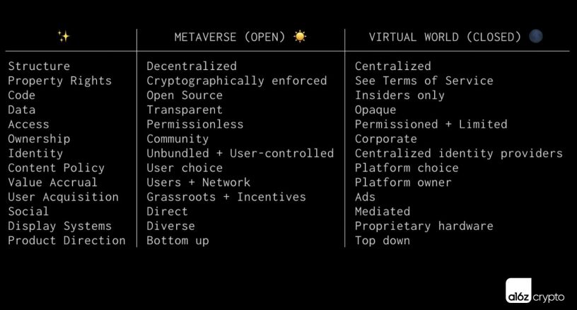 一个开放的元宇宙是去中心化的,允许用户控制身份,强制执行产权,调整激励措施,并确保用户(而非平台)获得价值。除其他标准外,开放的元宇宙也是透明的、无需许可的、可互操作的和可组合的(其他人可以在元宇宙内和跨元宇宙自由构建)。