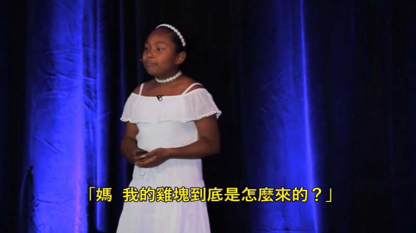 在影片中,吉恩希斯提到她四岁的时候,一天在吃鸡块时,她开始思考「我平常吃的鸡块是怎麽来的?」,而在她六岁时,当她看着妈妈哺育妹妹时,又想到「我平常喝的牛奶是怎麽来的?」,这些问题看似简单,但我们有没有尝试着思考答案。