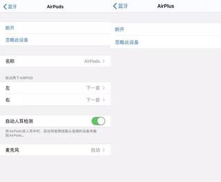 而在实际的AirPods详情界面(从蓝牙界面进入),真正的AirPods会有更改名称,自定义左右耳操作,入耳检测和麦克风等设置,airplus则是跟其他那些普通的蓝牙耳机一样,除了连接断开,就没有任何别的操作空间了。而实际也是如此,连接AirPods後,你的音量控制自动也就变成了AirPods特有标识,其他的蓝牙耳机则完全不同。
