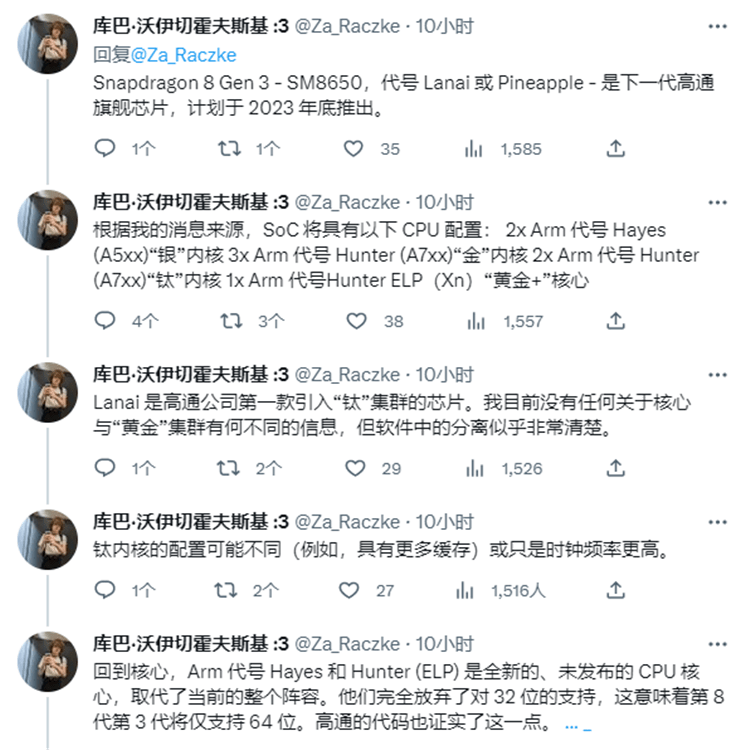 根据推特网友的爆料,第三代骁龙8将会采用1 2 3 2的架构设计,包括1颗代号为Hunter ELP的「gold 」超大核、2颗代号为Hunter的「titanium」大核、3颗代号为Hunter的「gold」中核,以及2颗代号为Hayes的「silver」小核。