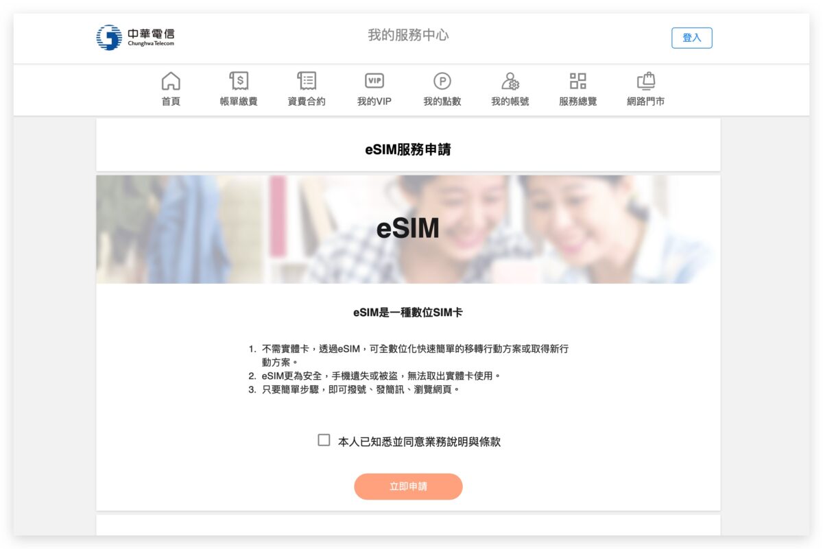 首先我们要先进入到中华电信 eSIM 卡的申请专区,并且同意相关的注意事项。