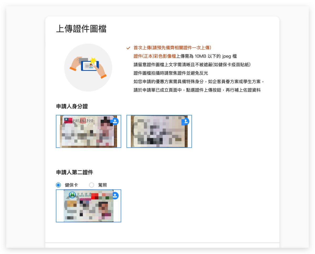 申请 eSIM 的第二步骤需要上传彩色的双证件正反面照片档案,第二证件可以使用健保卡或驾照。