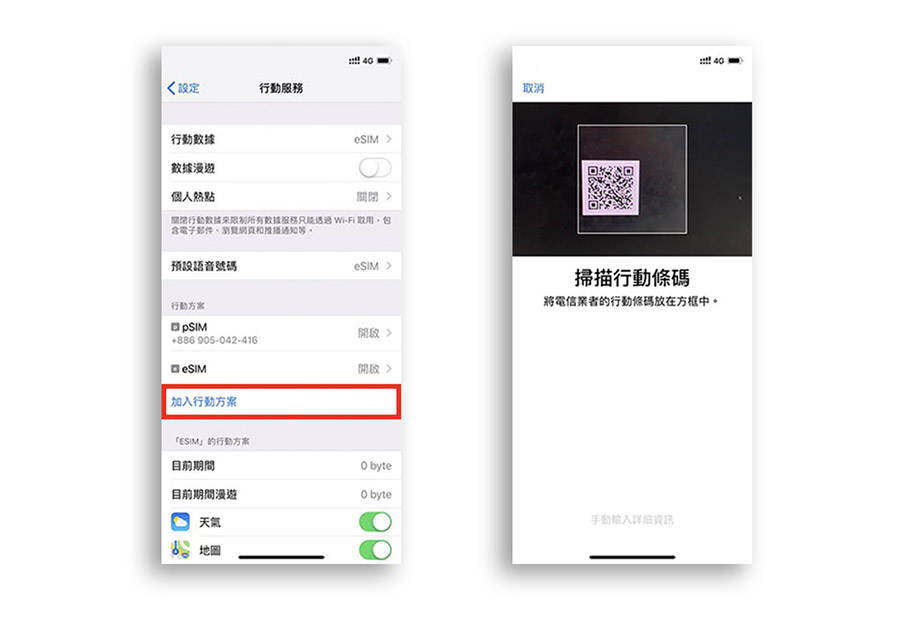 首先开启 iPhone 的设定并且点开「行动服务」功能,点选「加入行动方案」,然後透过开启的相机扫描中华电信提供给你的 QR Code。