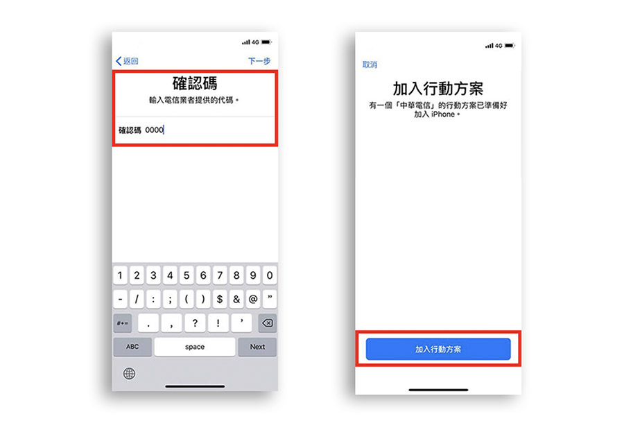 接着输入中华电信申请 eSIM 预设的确认码 0000,并且确认加入中华电信 eSIM 的行动方案。