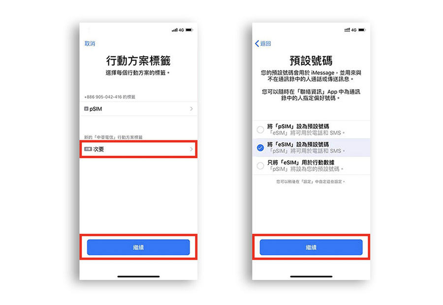然後我们可以选择把 eSIM 当作是预设的行动电话选项。