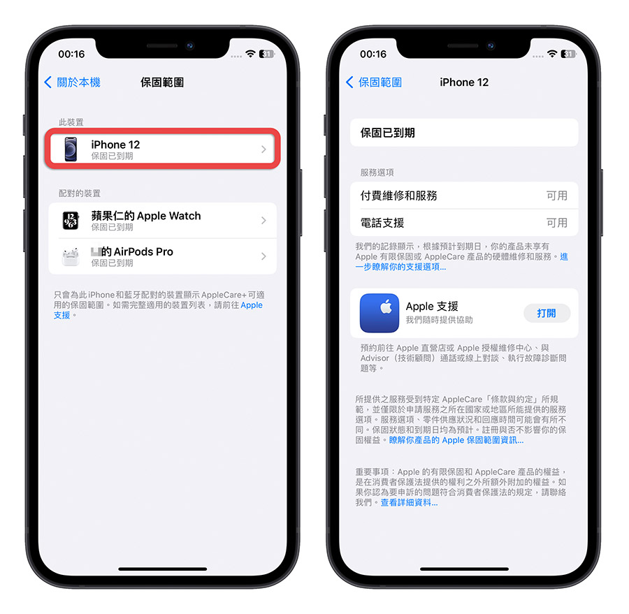 只要从 iPhone 的设定中打开使用「保固范围」这个页面的功能,就可以显示已经和这支 iPhone 配对的 配件的保固资讯,方便很多。