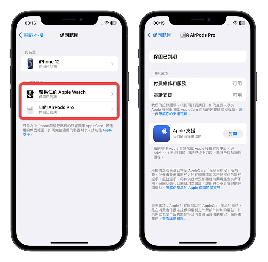 那再回到上一页,在 iPhone 保固资讯的下方就会显示目前已经和这支 iPhone 配对的 AirPods、AirPods Pro、Apple Watch 的保固资讯;同样可以点击每一项产品项目的名称查看更详细的保固内容以及使用 Apple 支援服务。