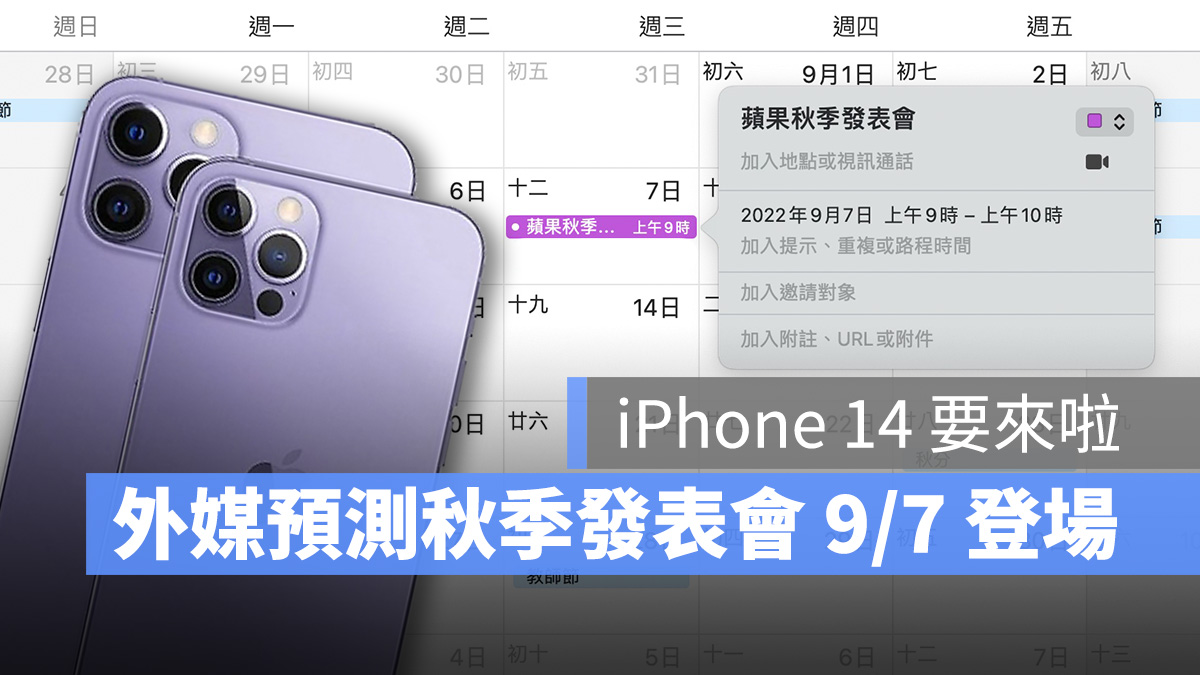 彭博社的爆料大神 Mark Gurman 指出:2022 苹果秋季发表会将於 9/7 登场、iPhone 14 系列会在 9/9 开放预购、首发到货日则是定在 9/16。