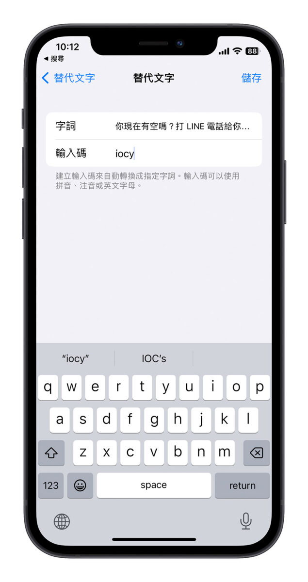 以我上面那个例子来说,我的缩写是「iocy」,最终要带出的文字是「你现在有空吗?打 LINE 给你一下」,所以就会变成: