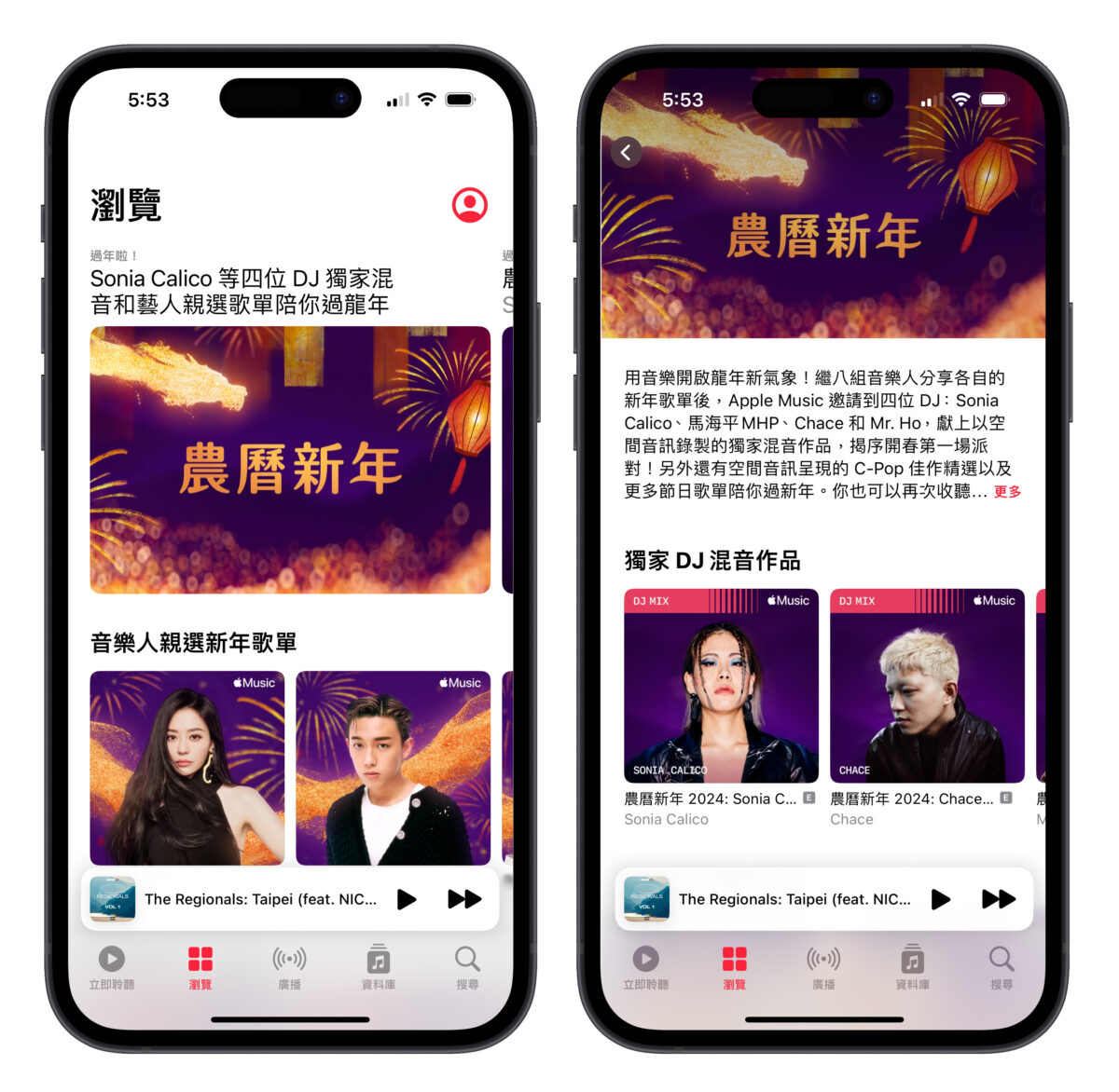 另外还有 4 位 DJ:Sonia、Calico、马海平 MHP、Mr.Ho 以空间音讯录制的独家混音作品可以享受;在 Apple Music 的「浏览」介面即可看到相关资讯。