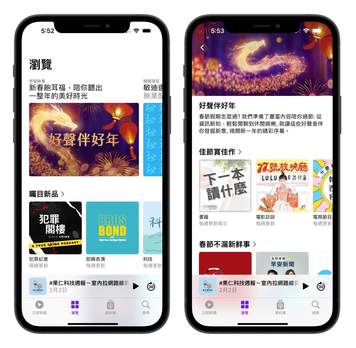 Apple Podcast 准备了三大主题、超过 20 个热门节目,提供丰富内容陪你过节。从资讯新知、轻松闲聊到休闲娱乐,就让这些好声音伴你发掘新意;一样在 Apple Podcast 浏览介面即可找到相关资讯,或是可以关注果仁的 Podcast 获得更多第一手科技新讯。