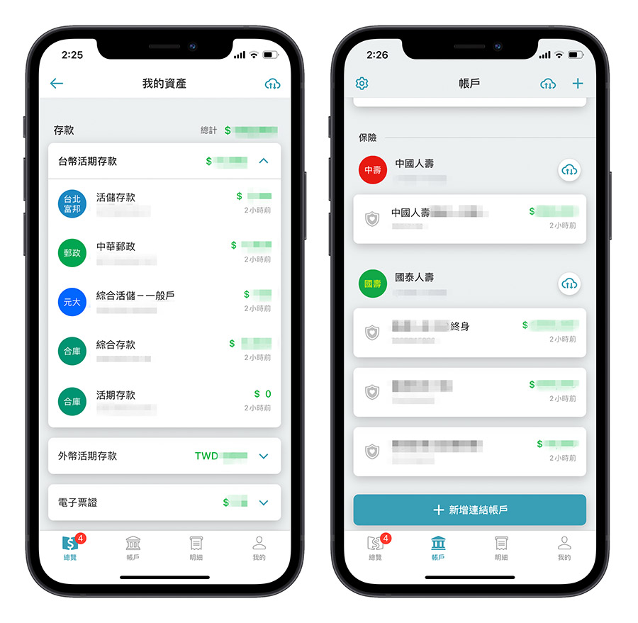 此外,还能今多家银行的帐户料整合在一起,包括信用卡、保险、不动产、定存、贷款…..等资料,只要一个 App 就可以一目了然,非常方便。