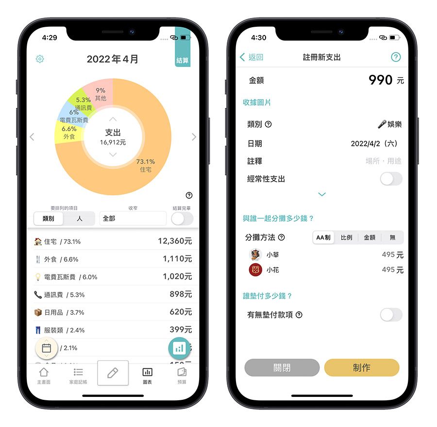 此外,《Money+》不只记帐功能丰富,财务报表的呈现更是多元,除了我们常见的收支分类占比原饼图以外,还可以呈现家庭成员中每个人花了多少钱的比例图,如果有输入每月预算的话,还可以看看这个月每个项目的花费占该预算的多少比例,这个功能对於想要准确控管财务的人真的非常好用。