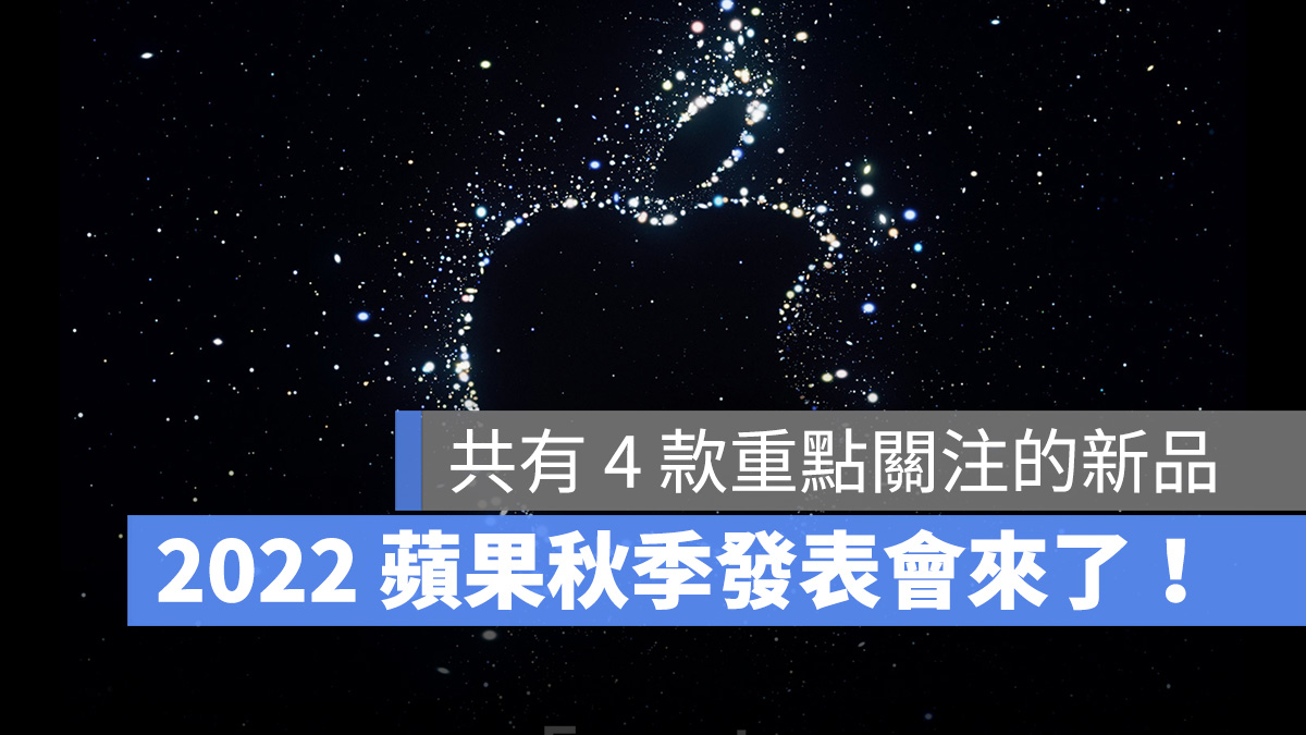 今日凌晨苹果正式寄出邀请函,2022 苹果秋季发表会确定将在美国时间 9/7 早上 10点举办,台湾时间则是在 9/8 凌晨一点,这次秋季发表会一样也是采用线上直播的方式进行。