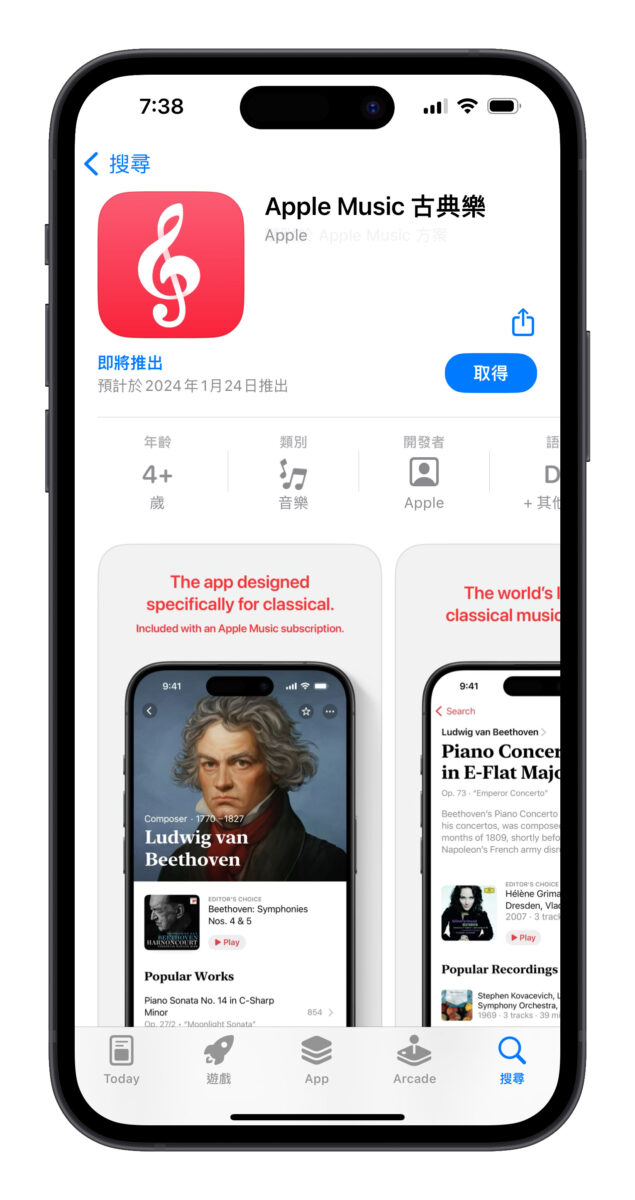 目前已确认 Apple Music 古典乐将於 1/24 开放台湾地区使用,有兴趣的用户现在就可到 App Store 中搜寻「Apple Music 古典乐」或点击下方连结预约下载;预约完成後 Apple Music 古典乐届时就会自动下载到手机上。