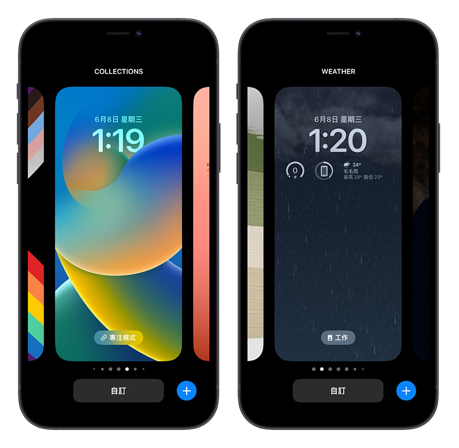只要在 iPhone 锁定画面上点一下,就可以进入到 iOS 16 的锁定画面组合选项,让你根据心情、根据需要更换不同的 iPhone 锁定画面,或者是自订 iPhone 锁定画面