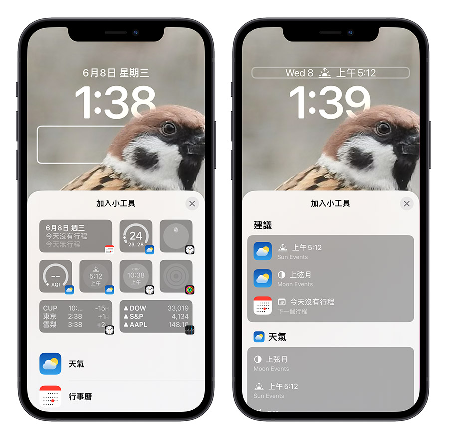 在时间区块的上面与下面都可以放,点一下这两个区块,就会跳出 Widget 小工具让你选择,目前仅有天气、行事历、股市、家庭、时钟、健身、提醒事项、电池与新闻这几个 App 的小工具可以加入。