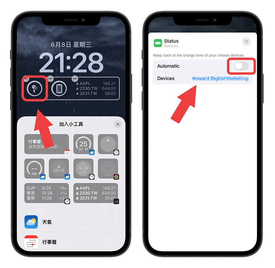 如果你的电量 Widget 总是显示 AirPods 或是 Apple Watch 这些周边设备的电量怎麽办?只要在自订模式下,点一下电量的 Widget,下方跳出「加入小工具」的选单後再点一下电量的 Widget,然後把「Automatic」关闭就可以自行选择要显示哪一个设备的电量了。