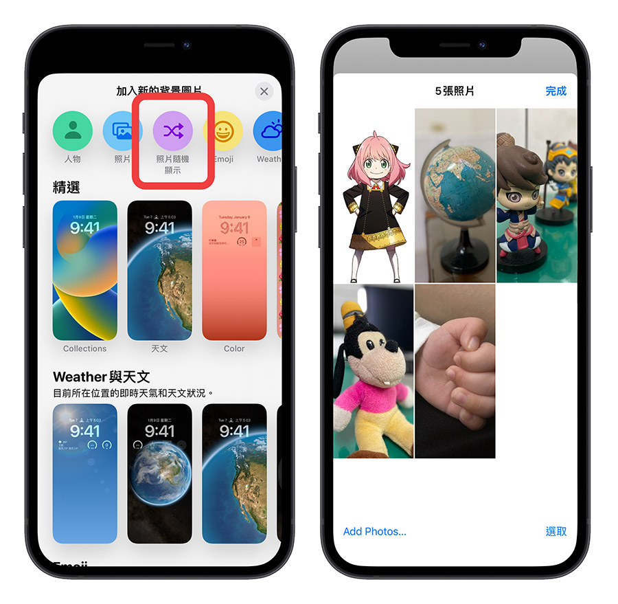 在自订模式下,用手指头点按萤幕就可以切换随机显示照片时,iPhone 锁定画面的桌布样式,方便你检视每一张照片的呈现效果。