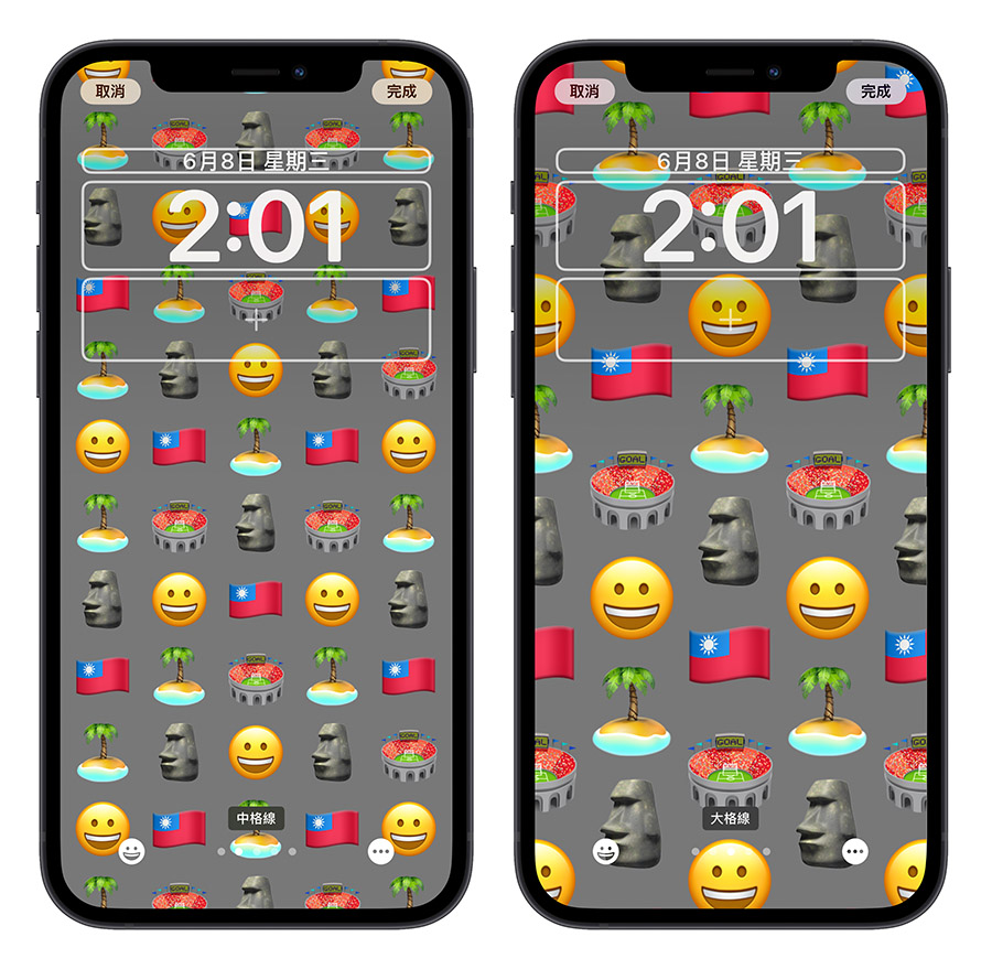 iOS 16 锁定画面的 emoji 显示方式总共有六种样式,有这种小格线、中隔线、大格线的显示方式。