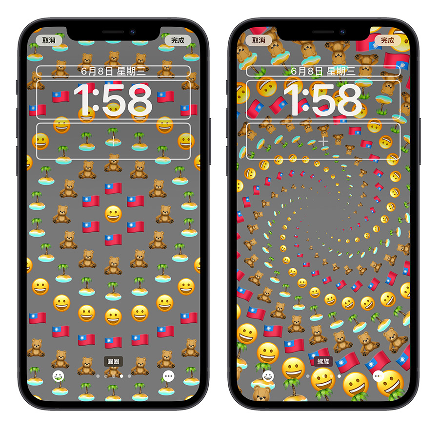 在选择背景的时候,你也可以使用 emoji 当作 iPhone 锁定画面的背景,点击左下方的 emoji 符号就可以添加最多 6 种 emoji 符号在 iOS 16 锁定画面的背景中。