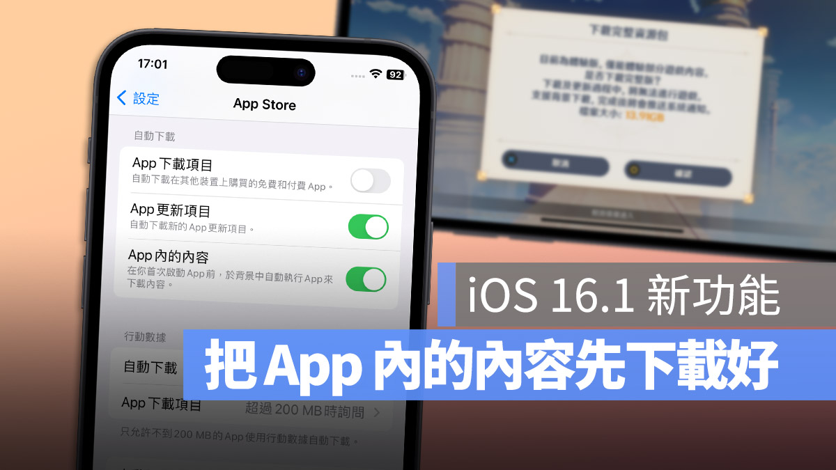 苹果在 iOS 16.1 Beta 3 加入的「App 内的内容」主要就是在你下载 App 的同时,顺便帮你把一些首次开启 App 後,还要再额外下载的内容也一并下载完成。