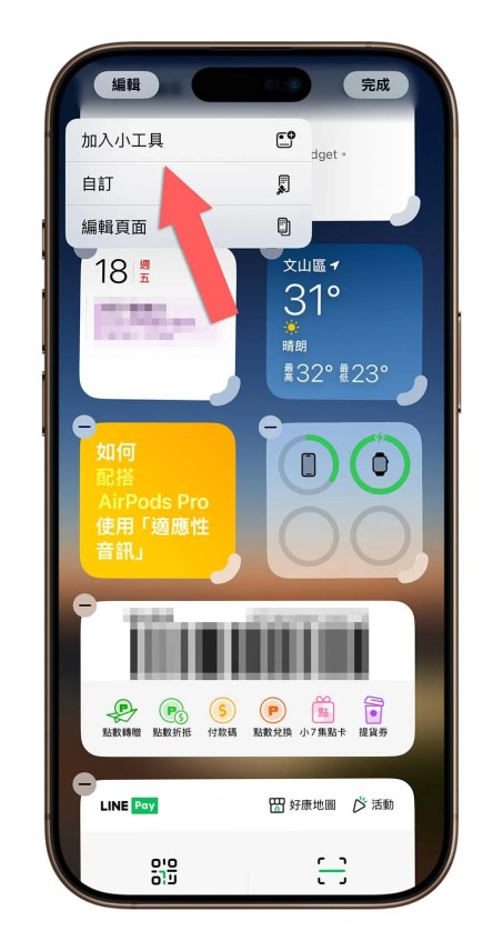 把《统一发票兑奖》App 更新完以後,在 iPhone 主画面滑到最左边,长按空白处进入 Widget 小工具的编辑模式,选择左上角的「编辑」按钮後,点选「加入小工具」。