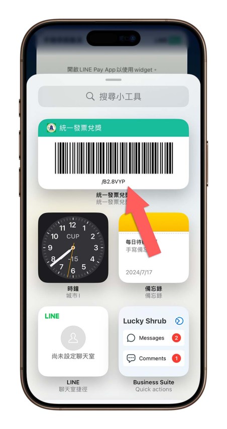 或者你也可以往下滑找到《统一发票兑奖》App 选项,然後选择里面的载具条码小工具来加入到 Widget 画面中。