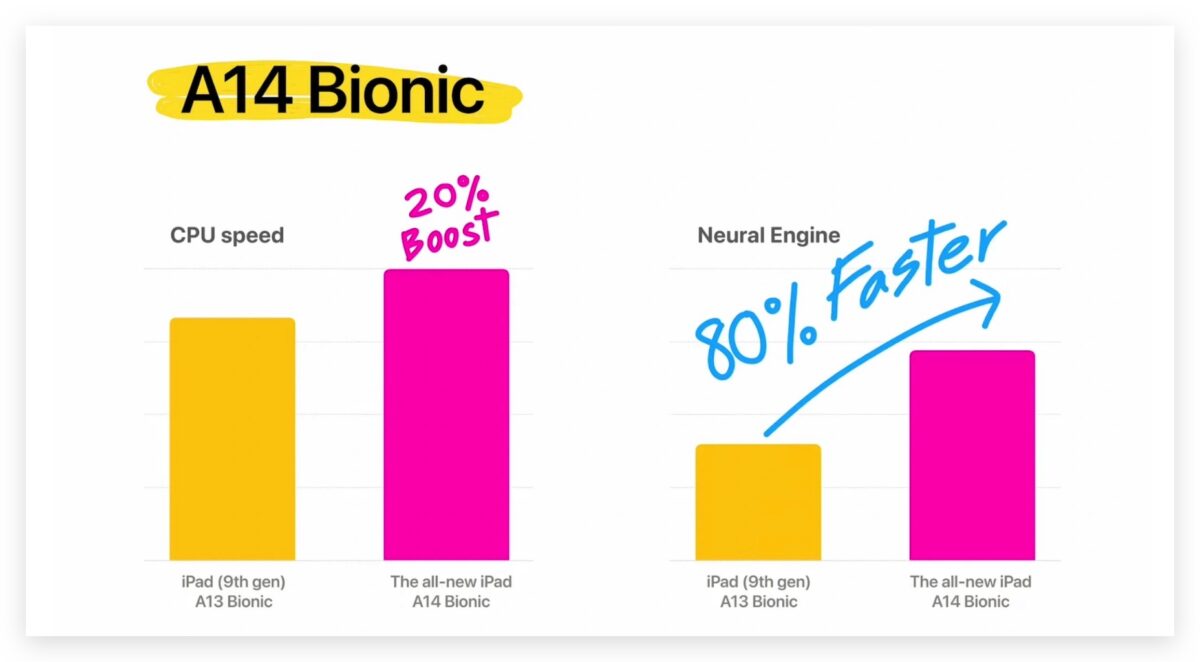 虽然在 CPU 与 GPU 的部分,iPad 10 与 iPad 9 的 A13 仿生晶片相同,但是在神经网络的部分,iPad 10 则提供了 16 核心的神经网络引擎,iPad 9 仅有 8 核心,因此对於机器学习以及运算处理的速度会快上大约 80%。