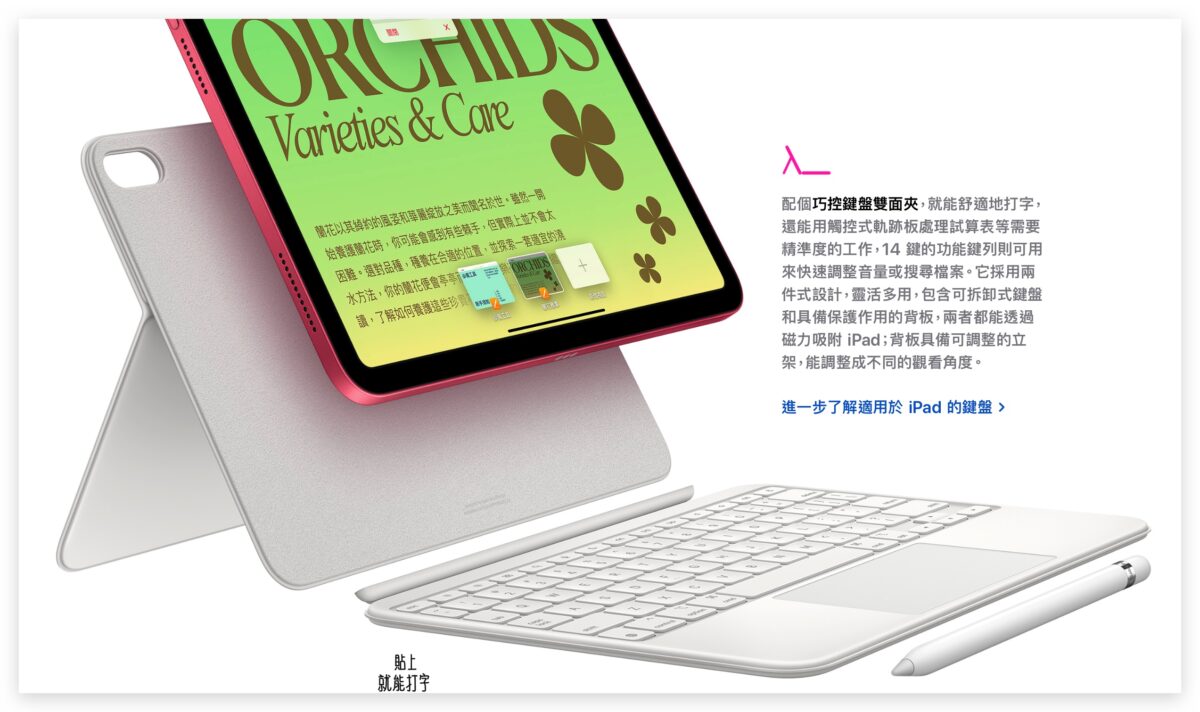 iPad 10 可以使用最新推出的巧控键盘双面夹,两件式设计的巧控键盘双面夹提供了键盘与轨迹板的功能,在背面的部分还有立架可以随意调整角度,让你舒适地打字、使用触控式轨迹板并调整看萤幕的方式。