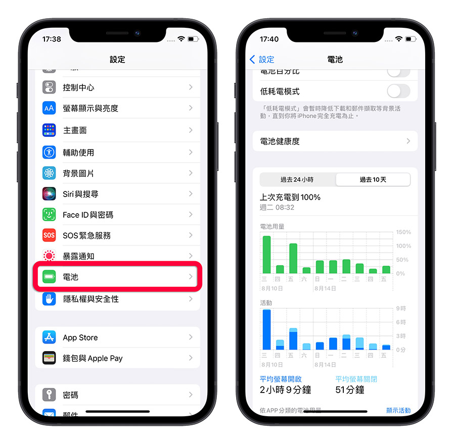 想要查询 iPhone 中,每个 App 的耗电量,我们可以开启「设定」的「电池」功能,在这个功能里,你最先看到的会是整个 iPhone 在过去 1 天内或是 10 天内的电池耗电状况,以绿色的长条图显示;蓝色的长条图则是你开启 iPhone 使用萤幕的时间。