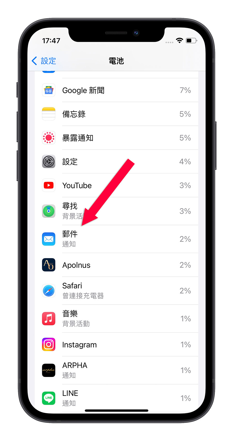 例如下面这个《邮件》App,在萤幕使用时间上看起来都是在背景执行,但也是有占总体耗电量的 2%。