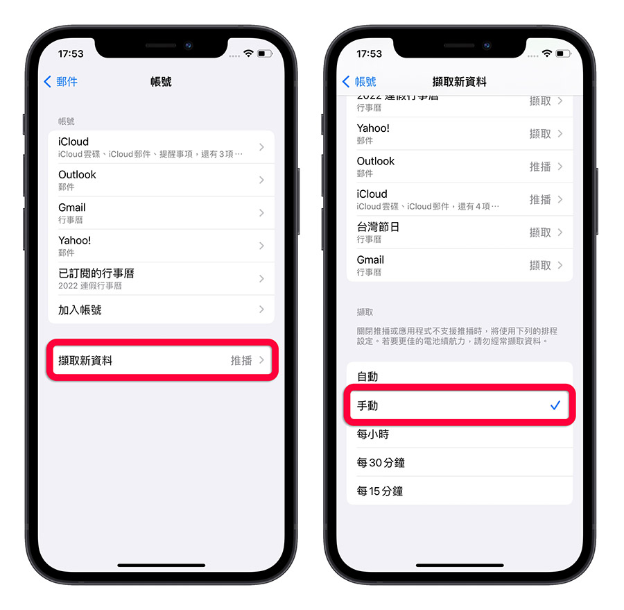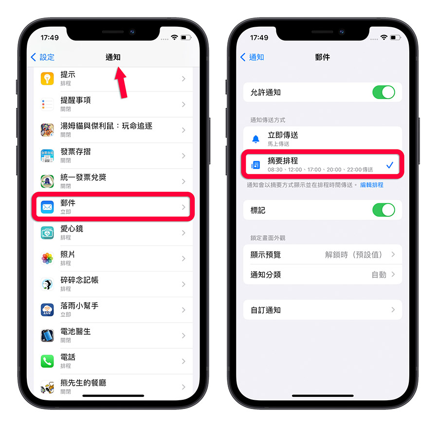 这个时候我们可以检查「通知」功能中的《邮件》选项,如果是不重要的 App,建议把「允许通知」关闭,或是把通知传送方式改为「摘要」,可以避免一直频繁地在传送通知,也是会造成 App 耗电的原因。