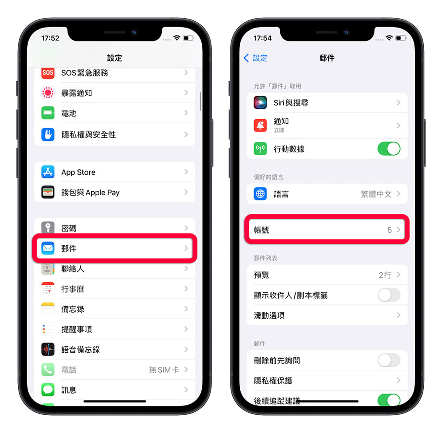 再来,我们回到「设定」的主画面,然後往下拉找到《邮件》App,进入「帐号」功能。
