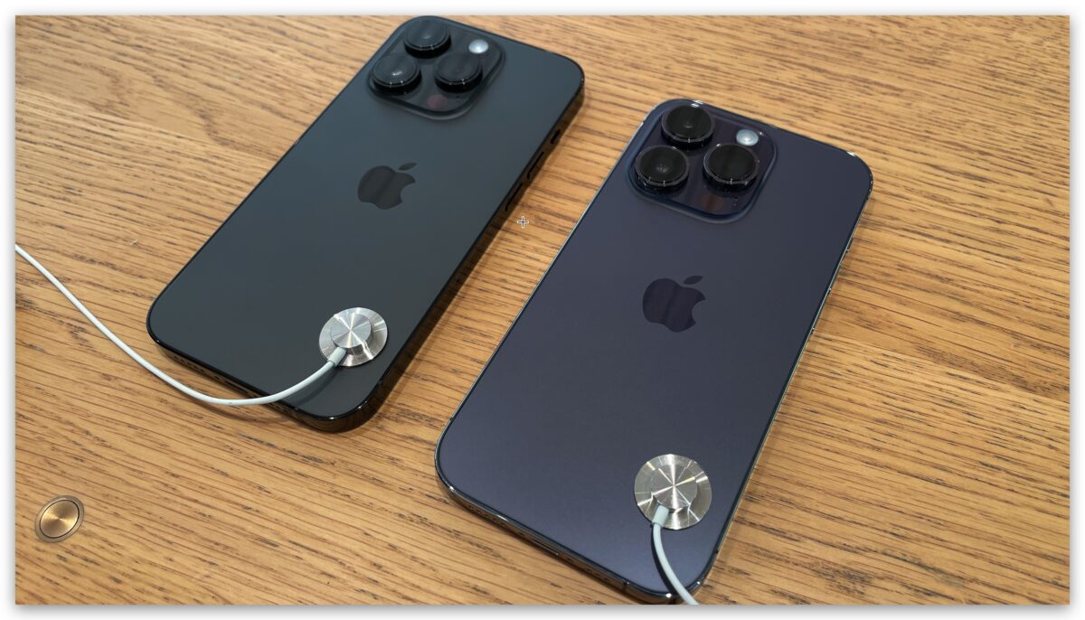 如果把深紫色 iPhone 14 Pro 跟太空黑色的 iPhone 14 Pro 放在一起比较的话,会比较看得出来最新深紫色的样子,如果你用手把左边的太空黑 iPhone 14 Pro 遮起来的话,拿给身边的朋友看右边的深紫色 iPhone 14 Pro ,他可能会觉得「这是深紫色?这不是灰色吗?」