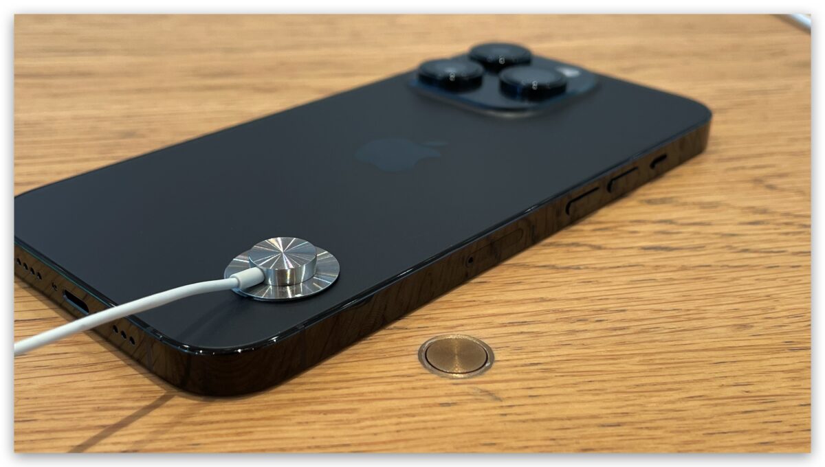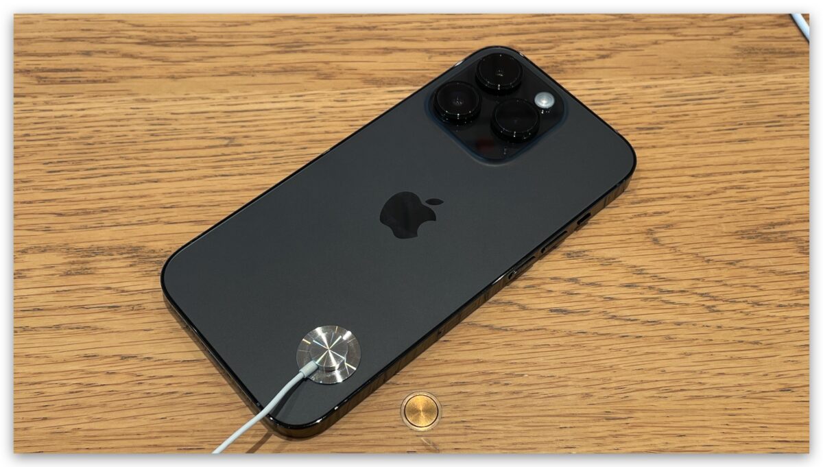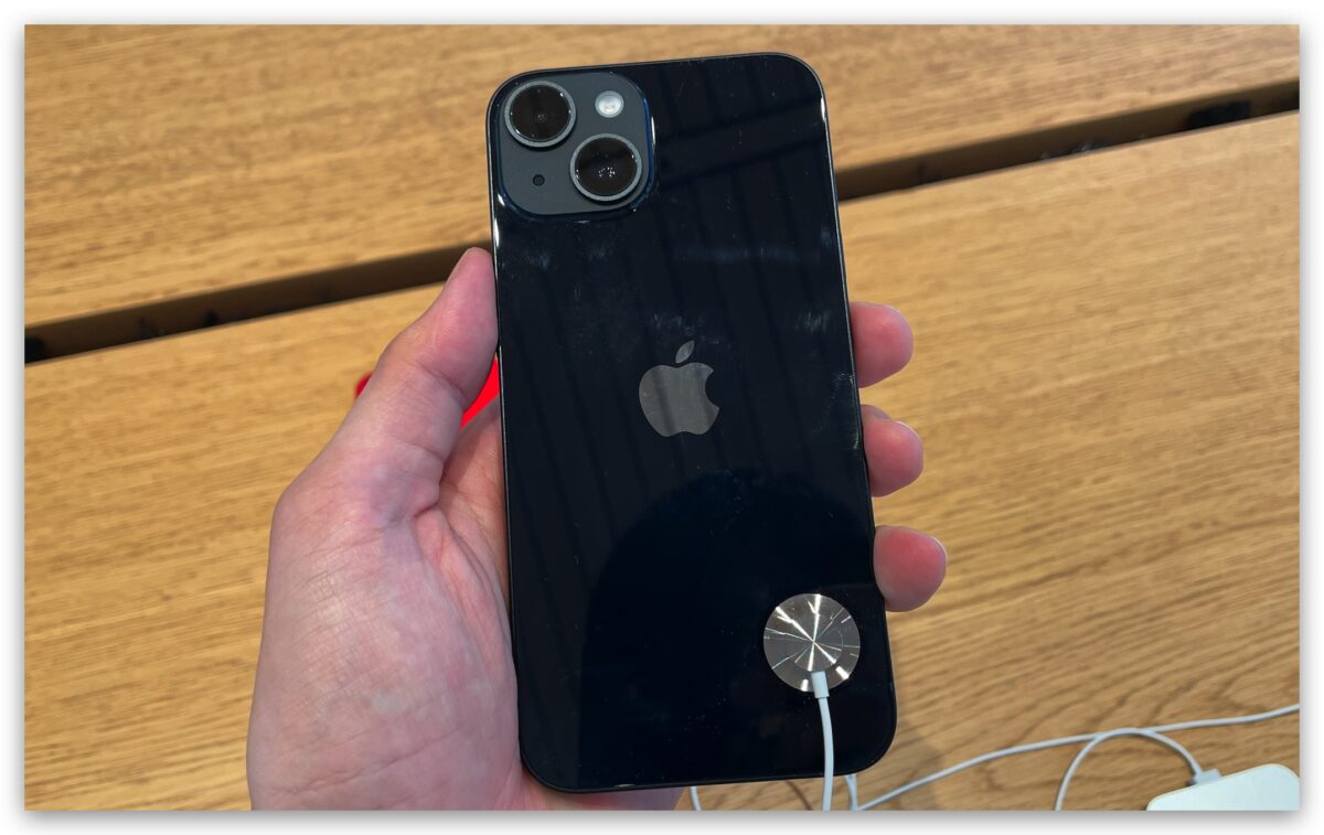 最新的 iPhone 14 Pro 在相机规格上有所升级,但是整个镜头模组变得又大又厚,虽然说这台展示机因为有一个防窃的装置,让 iPhone 14 Pro 放在桌上明显地飘起来了,但就算单看镜头的部分,跟桌面的距离还是有很明显的差距。