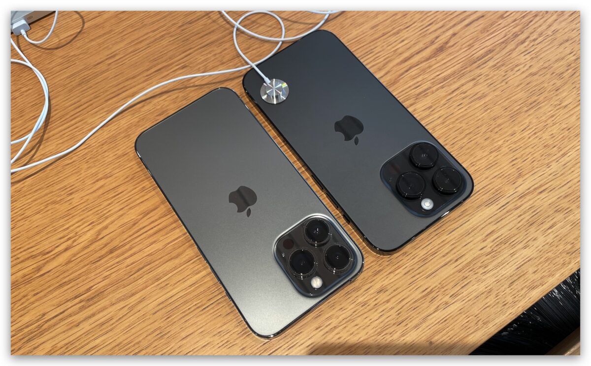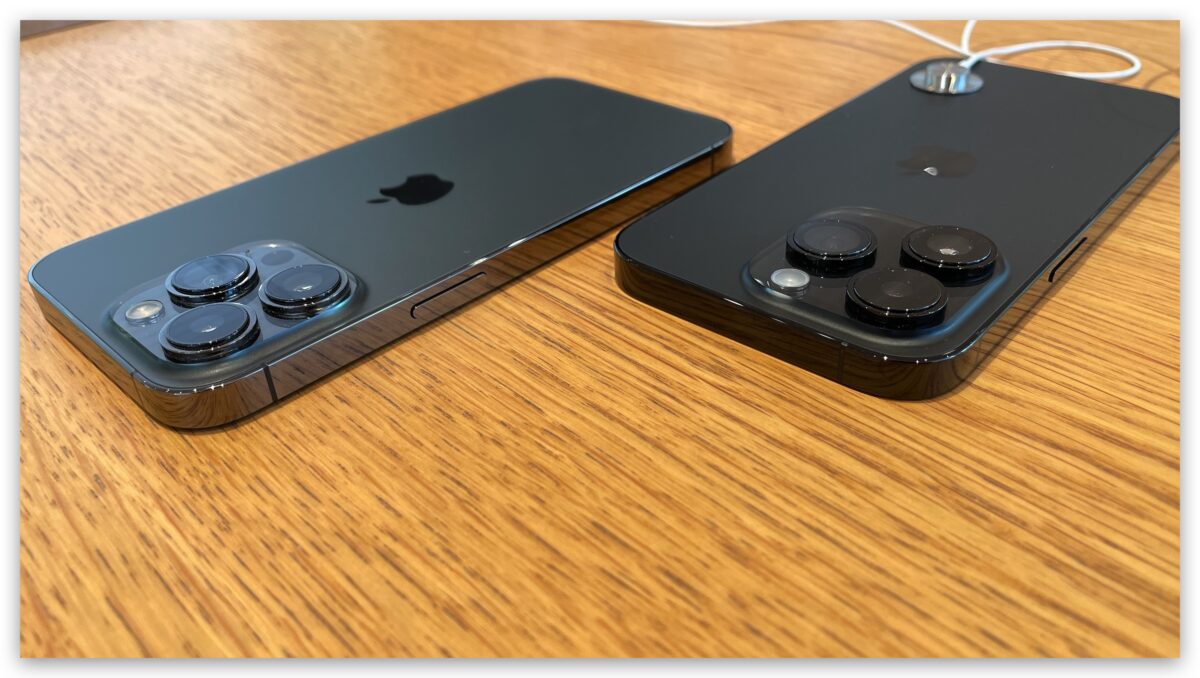 与 iPhone 13 Pro 的石墨色放在一起比较就可以看得更加明显,左边是 iPhone 13 Pro,右边是 iPhone 14 Pro。
