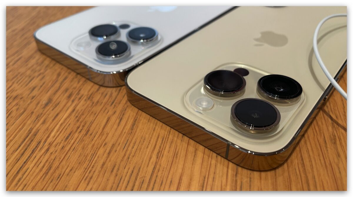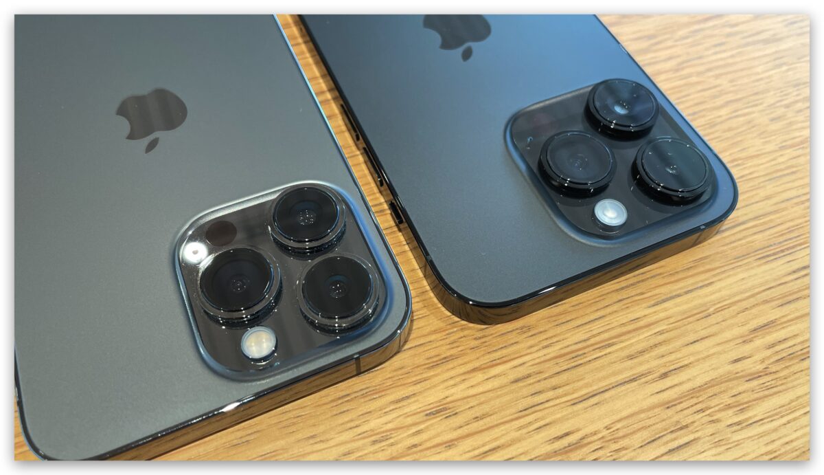 把 iPhone 14 Pro 跟 iPhone 13 Pro 放在一起比较的话,包含整个镜头模组以及每一颗镜头也都大了一点。