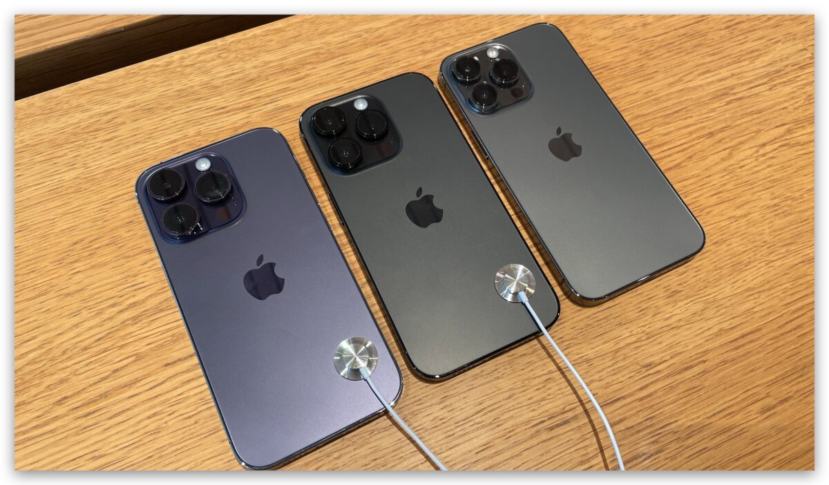 再把深紫色 iPhone 14 Pro、太空黑 iPhone 14 Pro 与石墨色的 iPhone 13 Pro 放在一起比较看看。