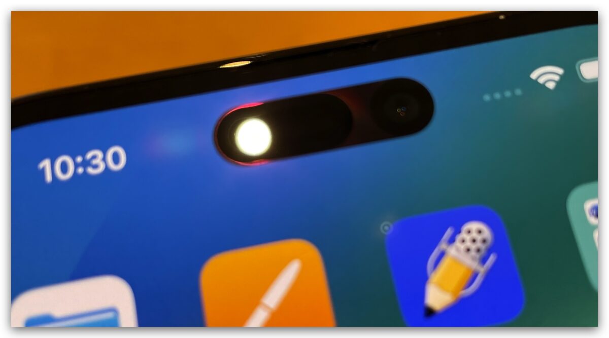 再来看一下这次 iPhone 14 Pro 的动态岛,仔细看其实可以发现他就是一个惊叹号的打孔萤幕,只是中间利用软体的方式以黑色的背景补起来了。