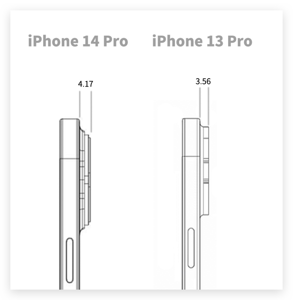 在最新 iPhone 14 Pro 的 CAD 设计稿中,苹果不仅让 iPhone 14 Pro 的机身比 iPhone 13 Pro 更高更厚,在原本已经凸出,且受人诟病的镜头模组上,苹果又再度加厚,从 iPhone 13 Pro 的 3.65mm 增加到 3.17mm,增加了 0.52mm。