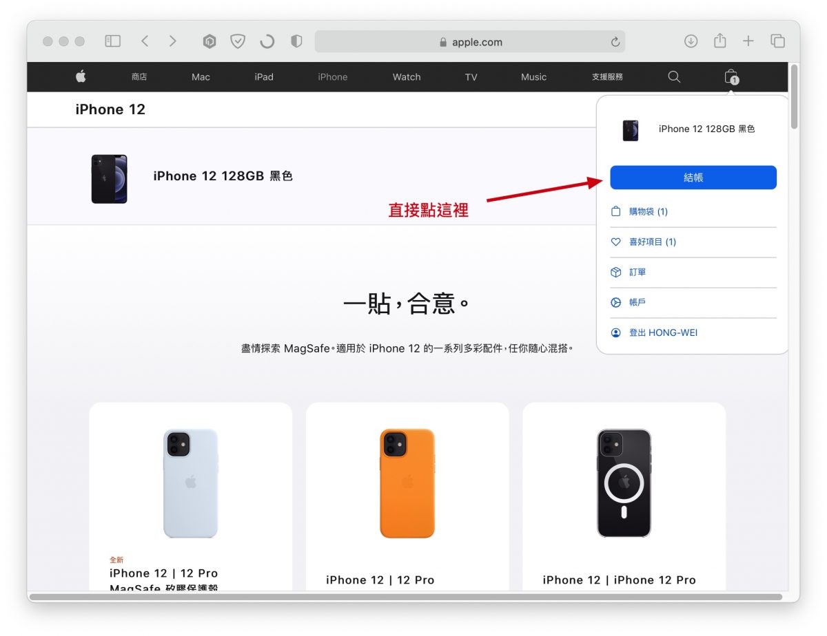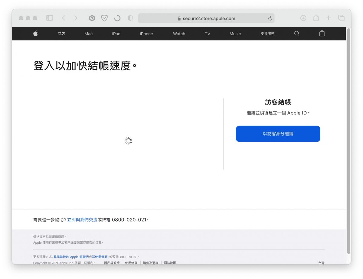 但其实在做完第二的步骤「加入购物袋」後,选右上角的「购物袋 icon」,然後点「结帐」 按钮,就可以进到询问是访客或者要求登入 Apple ID 的页面,这样就又比其他人少了一个页面的时间。