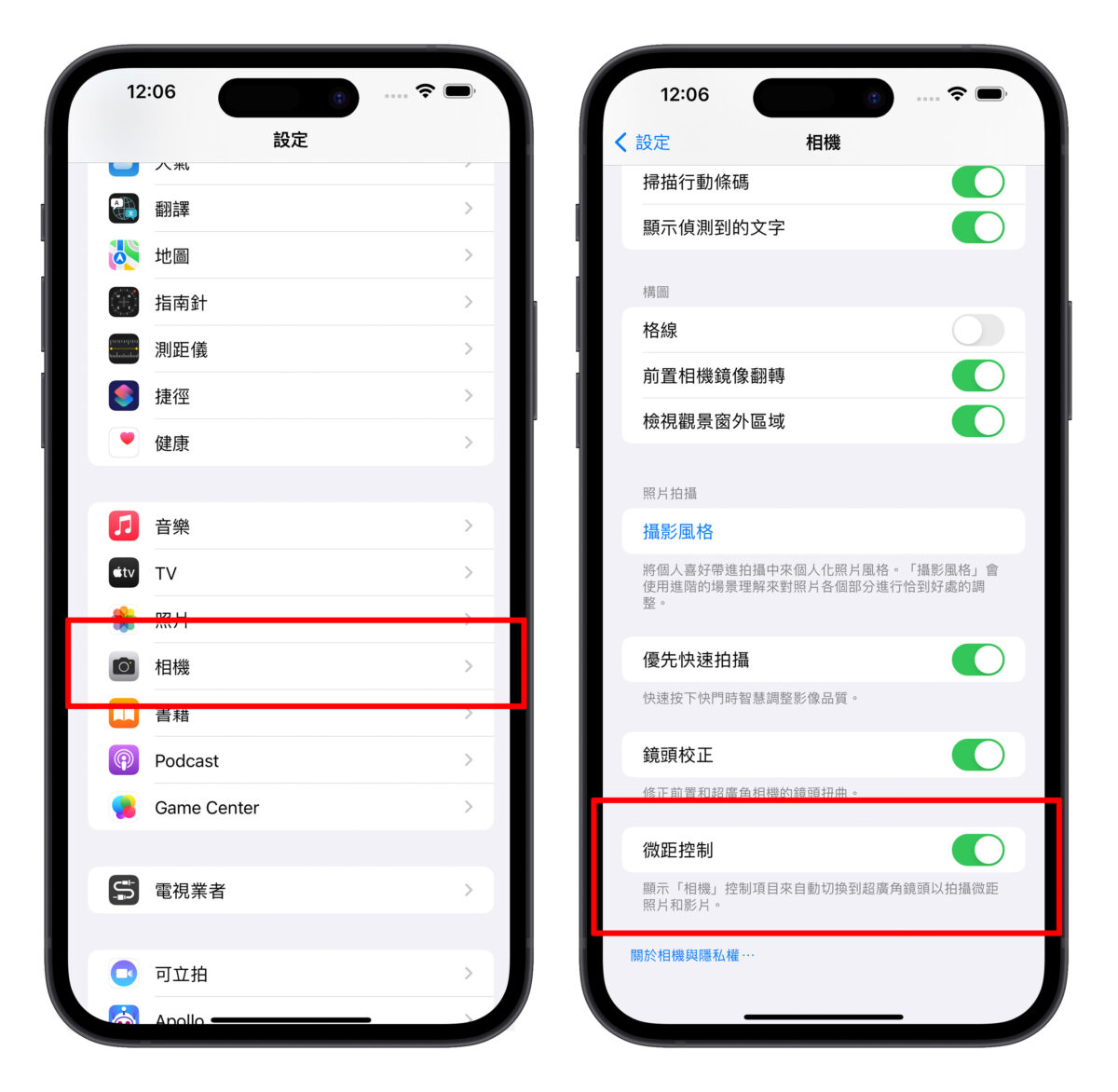 如果不想要让 iPhone 14 Pro 自动切换微距摄影,也能调整成让用户自己手动控制是否启用微距摄影;开启「设定」>「相机」,然後往下拉到最底部,开启「微距控制」选项即可手动控制微距摄影。