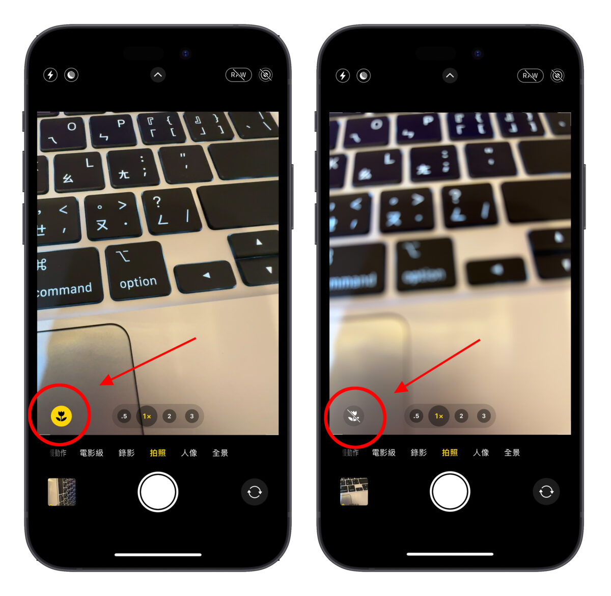,只要点击这个小花符号就会关闭微距模式并切回原本使用的镜头;再点一下则又会切回超广角镜头启动微距模式。