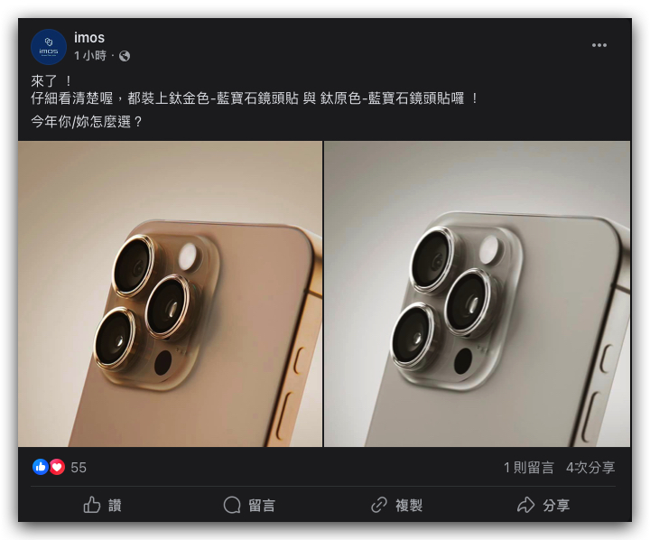 由於前几年 imos 也曾在发表会前於粉专贴出 iPhone 新机镜头贴的产品照,颜色也是准确预测,所以基本上是有一定的可信度。