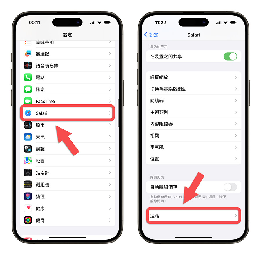 如果是单纯只想要清除 iPhone Safari 的快取资料,保留 Cookies、网站浏览纪录等内容,你可以透过 iPhone 设定中的「Safari」项目里面,滑到最下面选择「进阶」功能。