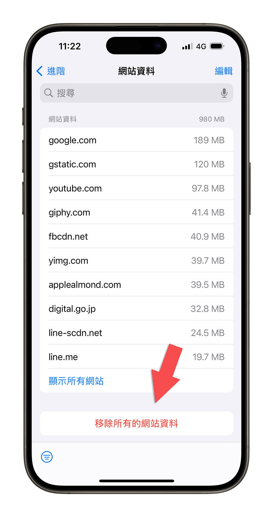 点选「网站资料」,这里面就存有 Safari 的快取内容,你可以单独针对特定的网站删除资料,或者是点选下面的「移除所有的网站资料」,就能够删掉 iPhone Safari 的快取,又不影响浏览纪录以及 Cookies 档案。