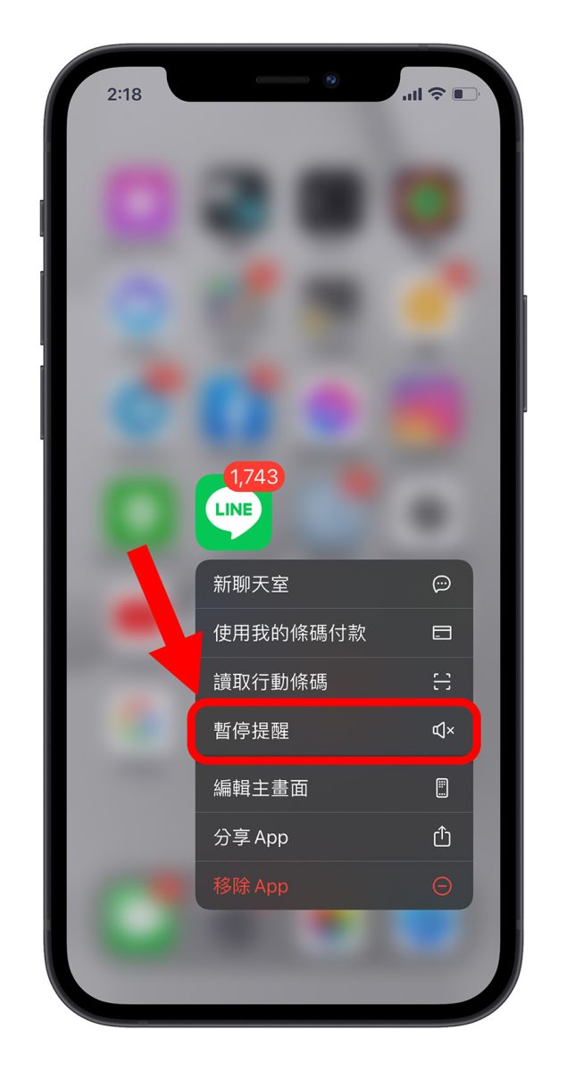 首先,我们可以长按主画面上的 LINE 图示,这时你会看到一个功能选单跳出,这边我们选择「暂停提醒」这个功能。