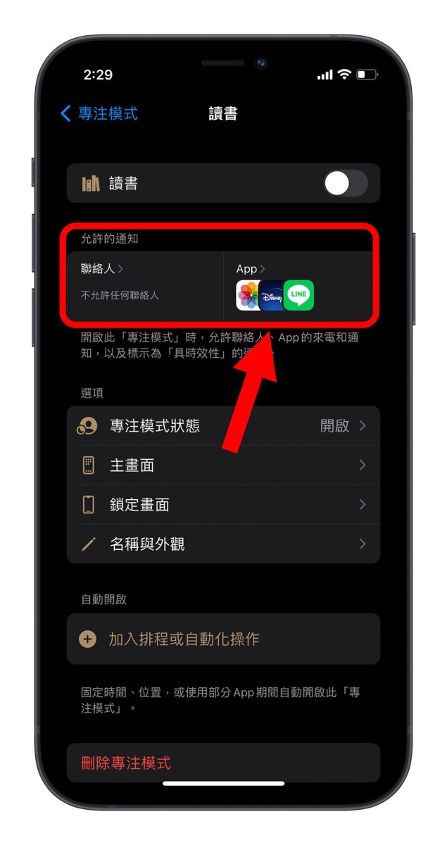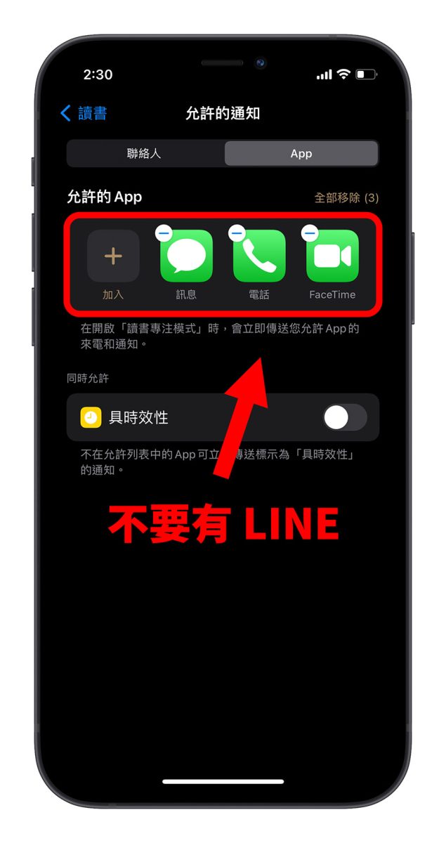在这边你可以加入任何你想要这个专注模式开启後,还能够显示通知的 App,其中,只要不要加入 LINE,那麽这个专注模式开启後,LINE 的通知提醒就会被关闭、暂停。